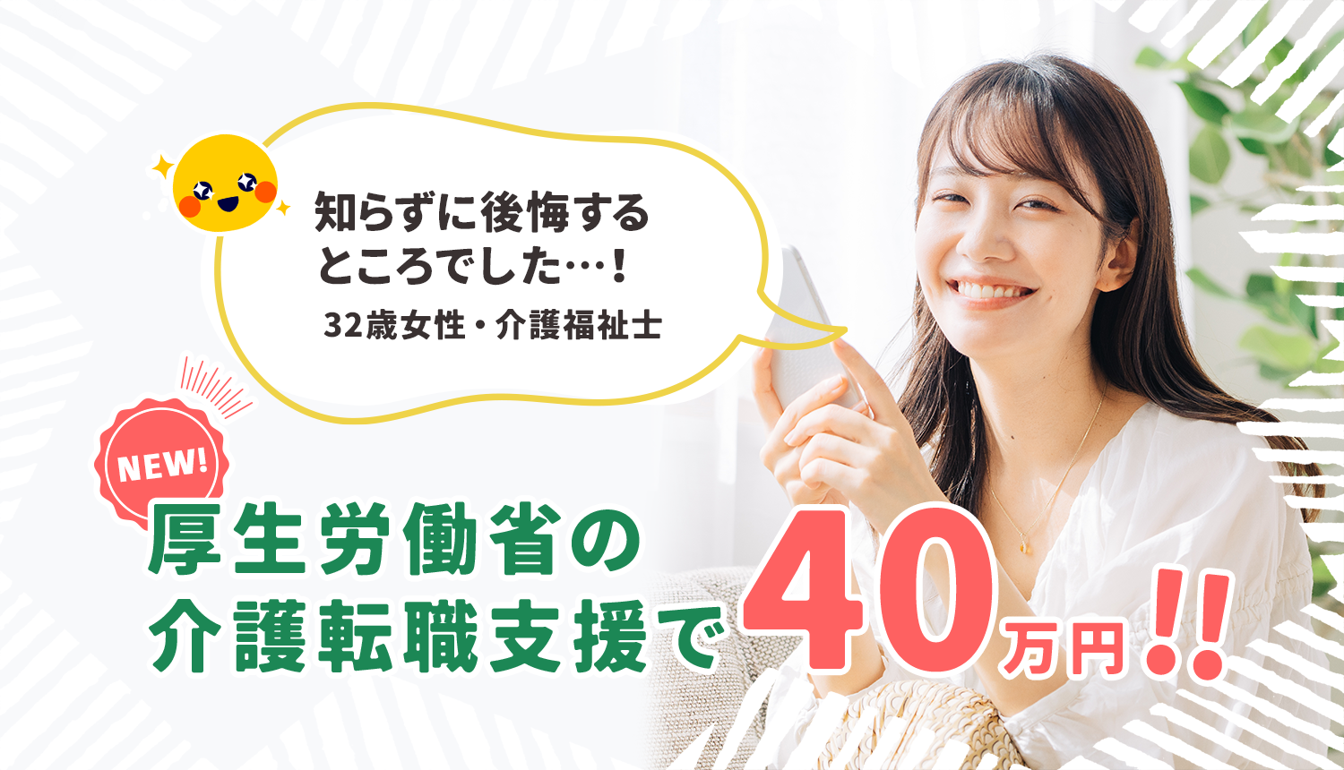 新卒で入社した老人ホームを退職し、老健へ転職しました。転職を機に引っ越しを考えていたのですが、この制度で40万円をいただき引っ越し代にあてました。すでに退職していたため不安もありましたが、自己負担がほとんどなく引っ越しでき、さらにいい職場とも出会えたのがとても嬉しいです。